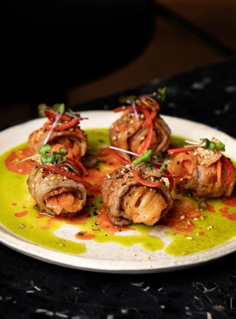 Leeks ash, togarashi, mint, basil, crispy leeks, garlic-yuzu sauce.