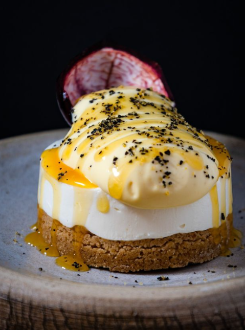 Lemon-yuzu cheesecake, passion fruit mouse, passion fruit sauce.