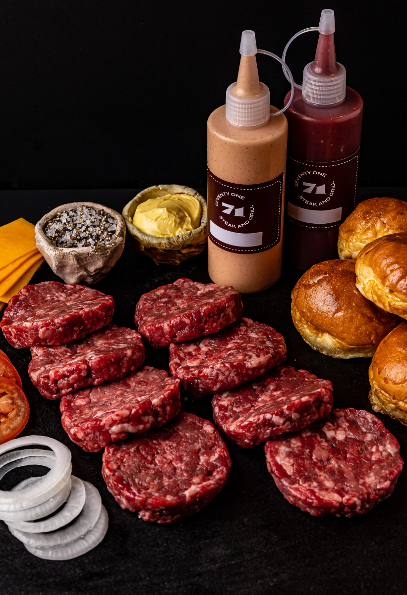 Grill up a mouth watering 71 burger in your own backyard. This DIY kit includes everything but the smoke.